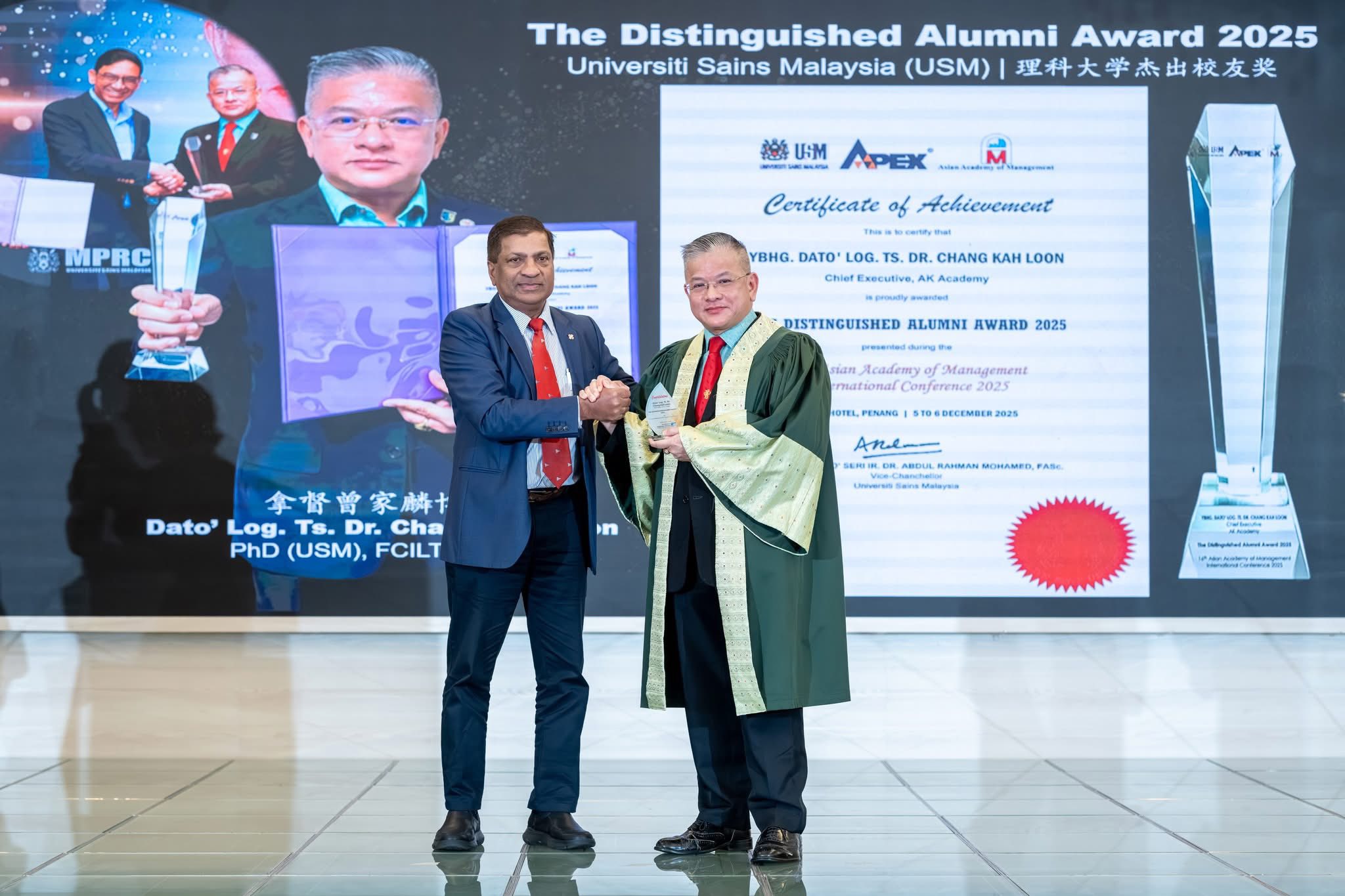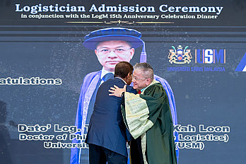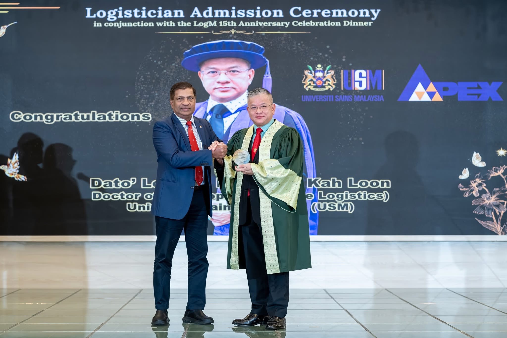 Capt. Log. Ananda Kumar presented congratulatory plaques to Dato' Log. Ts. Dr. Chang Kah Loon 拿督曾家麟博士, FCILT, FLogM, for his Doctor of Philosophy (PhD) (Maritime Logistics) from Universiti Sains Malaysia (USM) and for receiving the "Distinguished Alumni Award" from the same university (USM).
